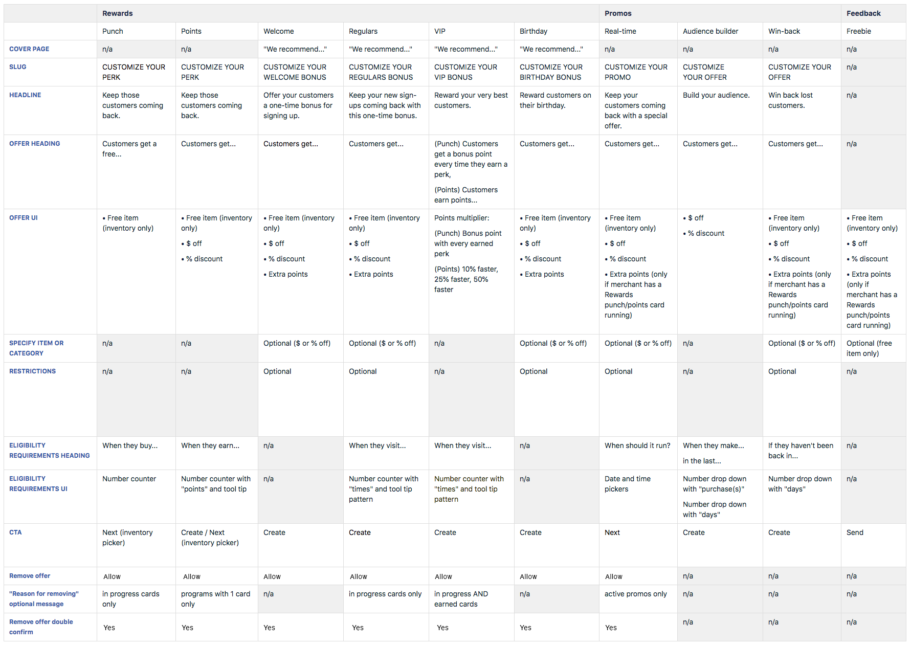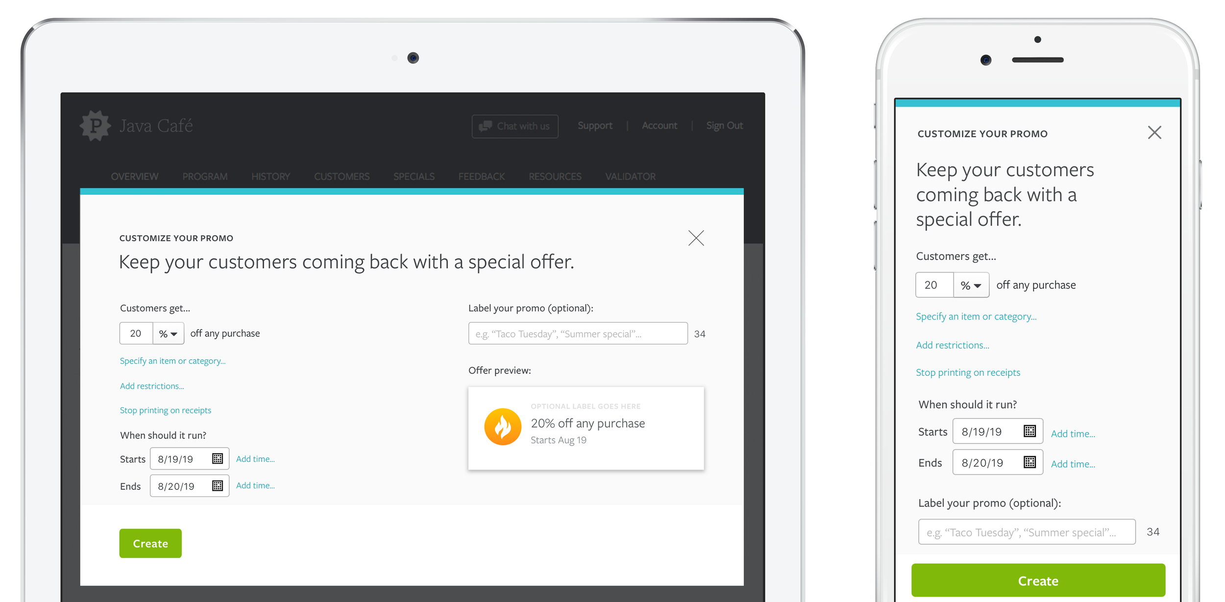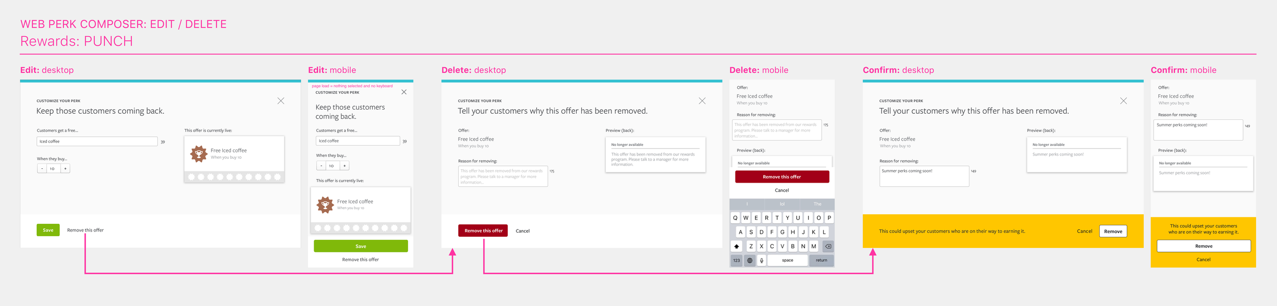 Merchants can manage their loyalty program by editing or deleting perks using the perk composer on the web or on their Clover device. “Disabled card states” promote human connection, encourage feedback, and enable quick resolutions. I designed this feature (and the unified card view as a whole) to maintain a warm, personal relationship between merchants and customers.
