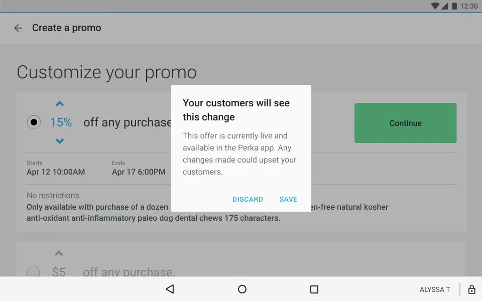 On device, an alert warns merchants when they end live offers early since customers have already seen them.