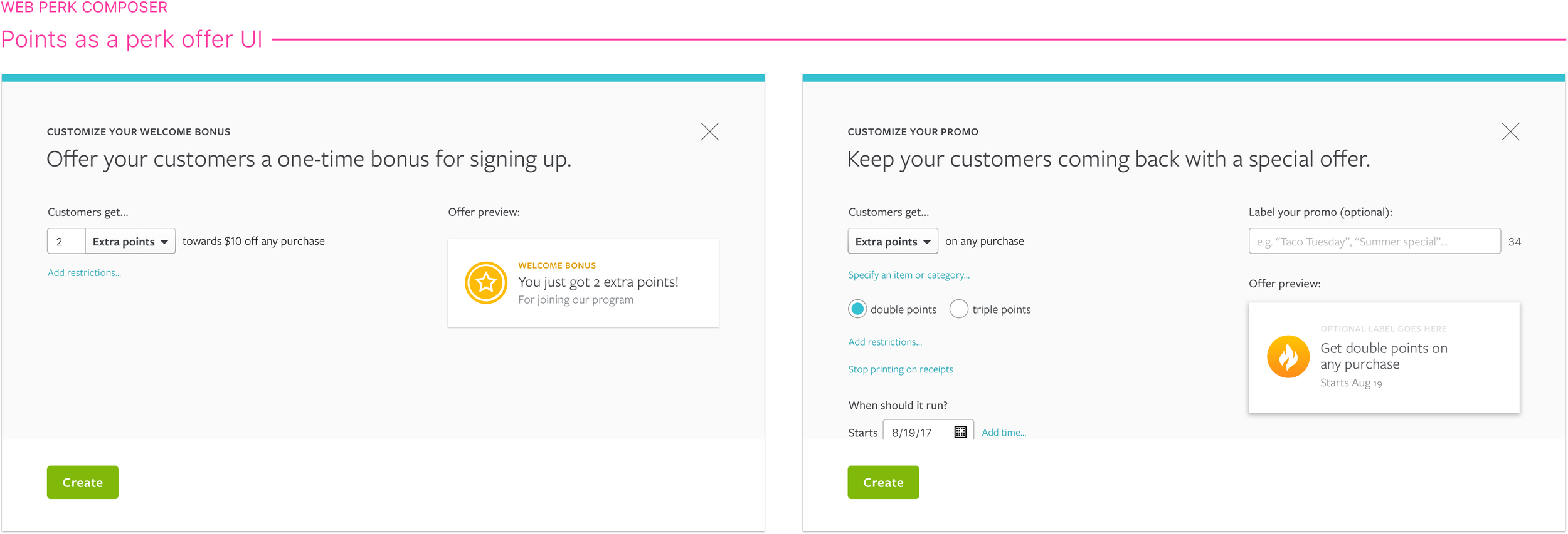 The unified perk system requires a way for merchants to create and manage perks for their loyalty programs in a standardized manner. To address this issue, I redesigned the UX of the existing perk composer to allow merchants to create the full range of perks now available in the system.
