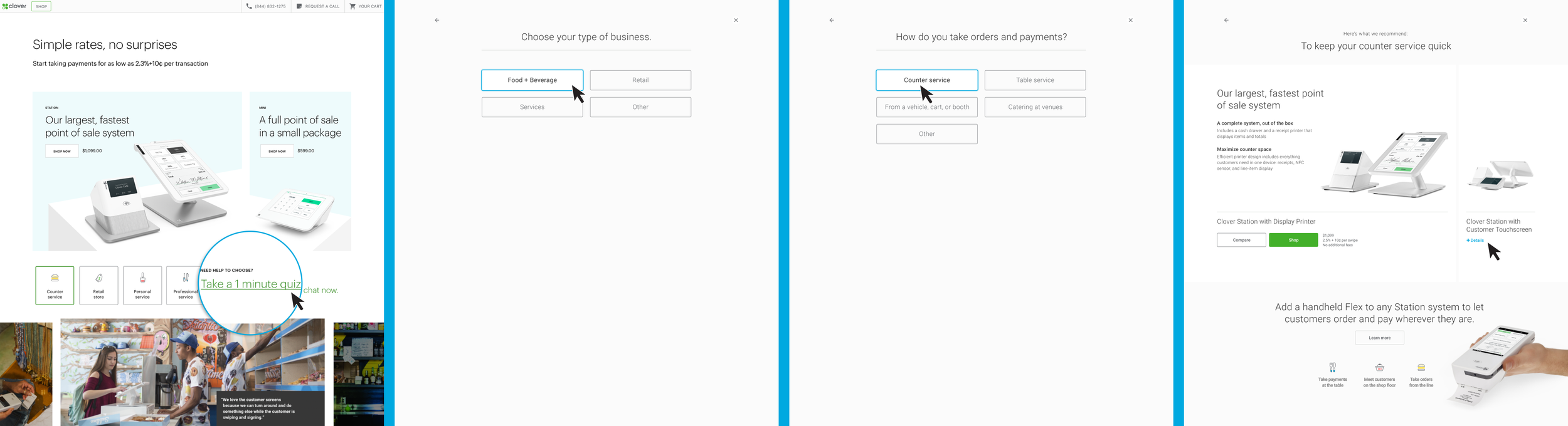 On the /shop homepage, merchants are prompted to enter a full-screen lightbox and answer three to four simple questions about their business. Based on their answers, a primary and a secondary Clover device are recommended. To display detailed product views and a side-by-side comparison, I created a slider module. Any add-ons are highlighted below the slider module.