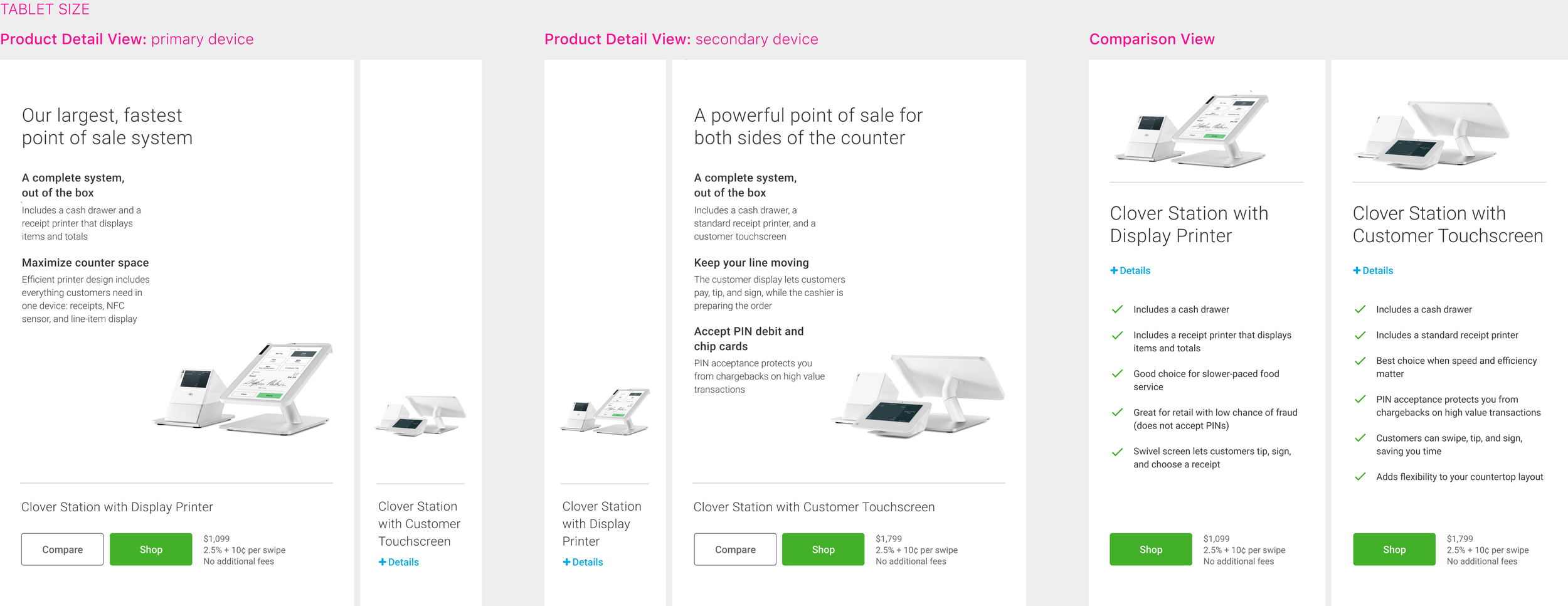 This module was designed to address space constraints, making it easy for users to switch between individual product details and side-by-side comparisons without excessive scrolling. It can also be found on Clover Station landing pages, where it compares up to three devices.