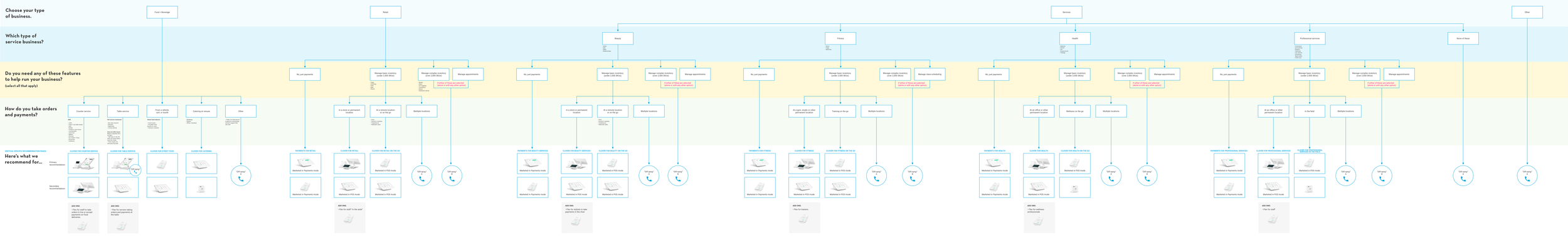 This data informed the questions that I needed to ask in order to correctly sort merchants by vertical and specific feature/payment needs. To keep users engaged, I streamlined the user flow and also created "off-ramps" to direct merchants to specialized apps in the Clover App Market. Merchants can also connect with the sales team if they require further assistance.